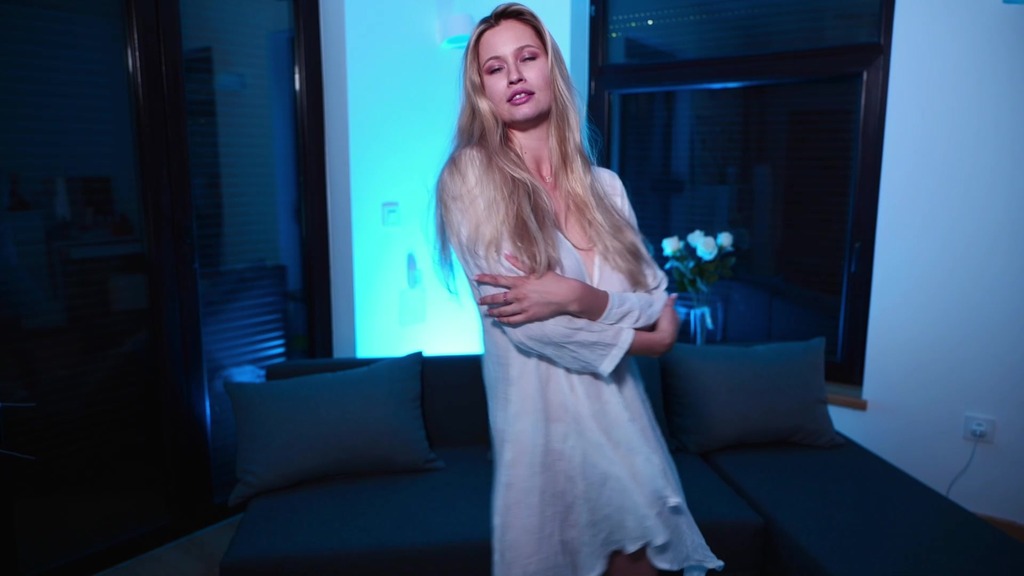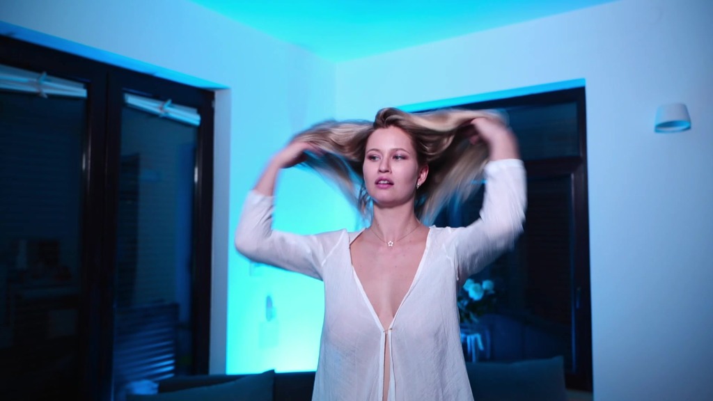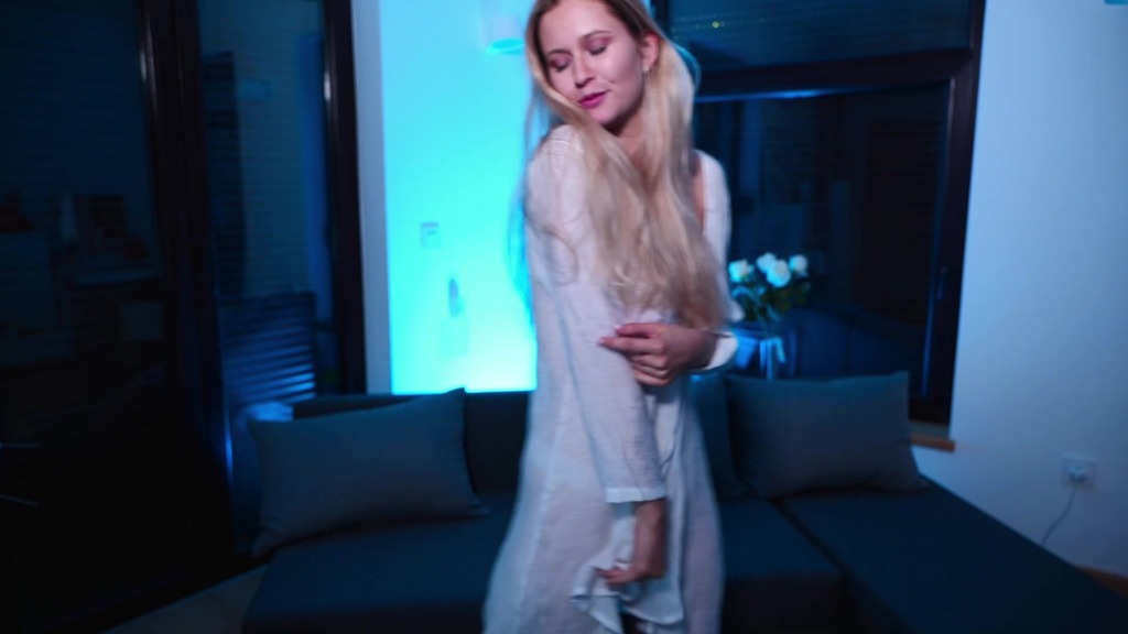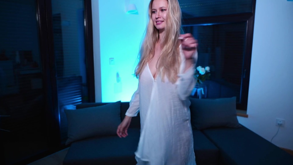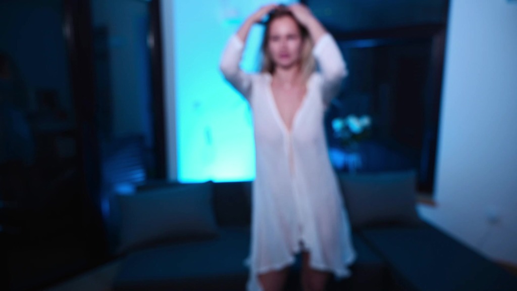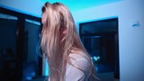 blonde in a white transparent shirt dancing