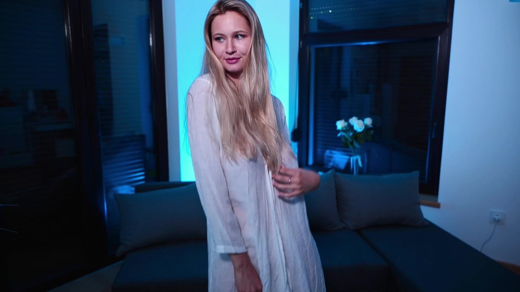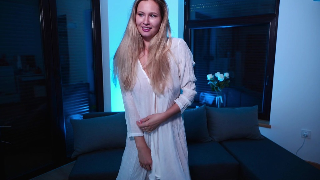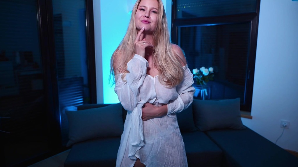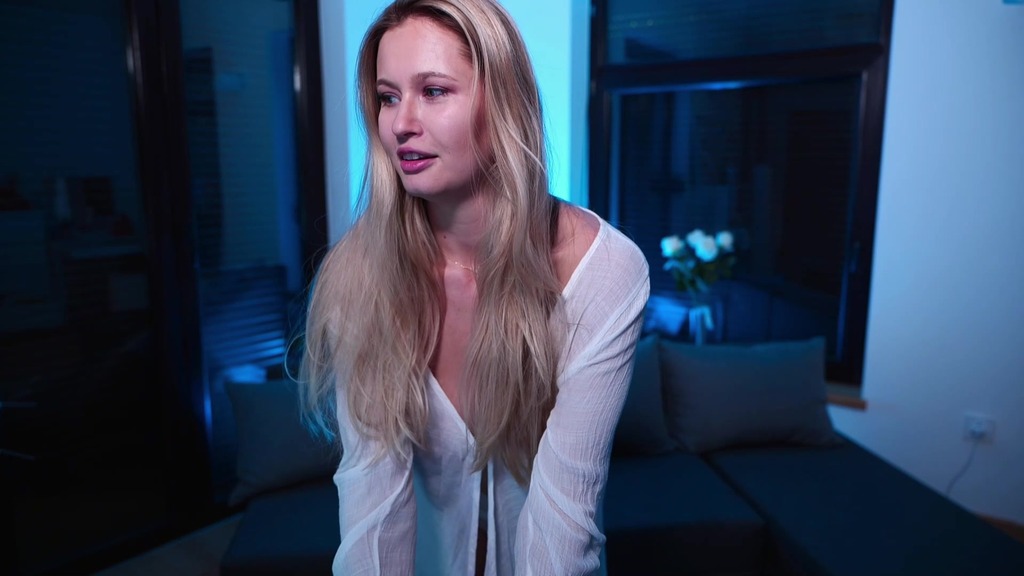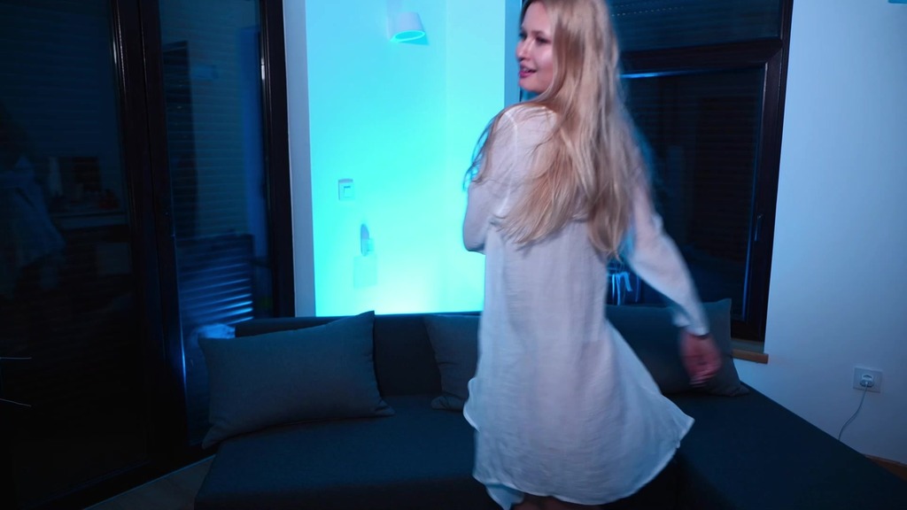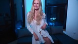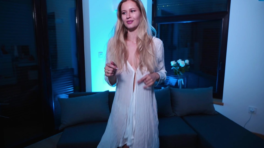 blonde in a white transparent shirt dancing